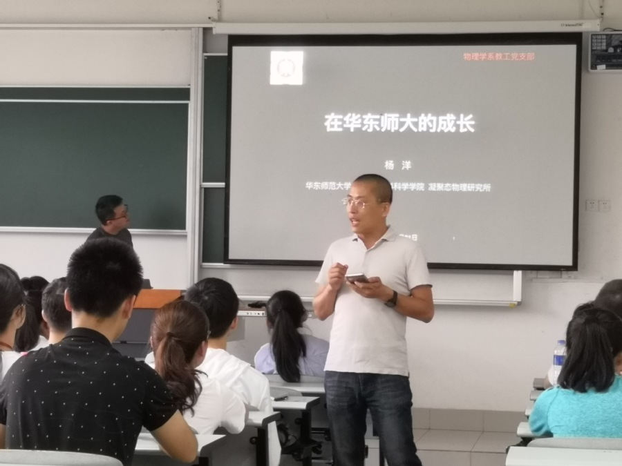 支部副书记杨洋老师为同学们作了题为《漫谈我在华东师大的成长》的报告。报告中,杨洋老师先从有趣的物理现象出发,对自己目前从事的研究工作做了简要说明,由自身经历出发,讲述了他在华东师范大学的学习、国外的科研深造以及回归母校工作的心路历程,从基本生活需要到远大理想,畅谈了我们为什么要工作,怎样去工作,话语间流露出了他对师大浓浓的爱与情怀。