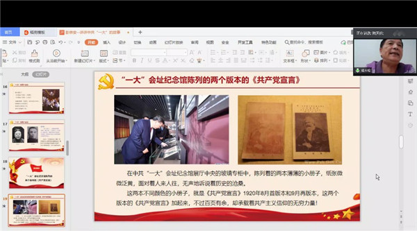 8月21日下午,物理与电子科学学院2018级闵行研究生党支部与宝山区党建服务中心联合开展“践行四史教育,凝聚前行动力”线上党史学习交流会。“四史口袋书”编者、宝山区友谊路街道基层理论宣讲团团长、社区党校讲师彭宗安同志应邀主讲《讲讲中共一大的故事》专题党课。校党委书记梅兵同志和支部全体党员同志参加学习,会议由高瑞新同志主持。