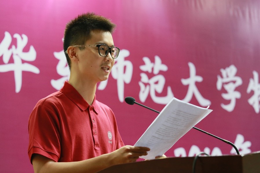 本科生新生代表、2019级物理类专业(师范)李成渊在发言中表示,物理学科的性质要求我们去观察世界、探索未知,大到宇宙,小到微观的原子、粒子,希望通过专业学习成长为客观、理性、智慧的人,进而在从事教师职业后更好地了解自己、指引他人。