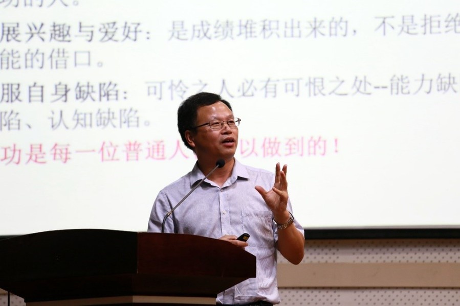 教师代表刘宗华教授以“笨鸟要先飞,一天都不能停”为题,强调“忘情于工作, 而忘记了自己”才能成为一名优秀的研究生,希望同学们尽快完成角色、任务、态度的转变,同时用“刘氏法则”概括了成功的路径:成功的人每一步都做了同龄人该做的事,最后祝愿同学们“鱼跃此时海,花开彼岸天”。