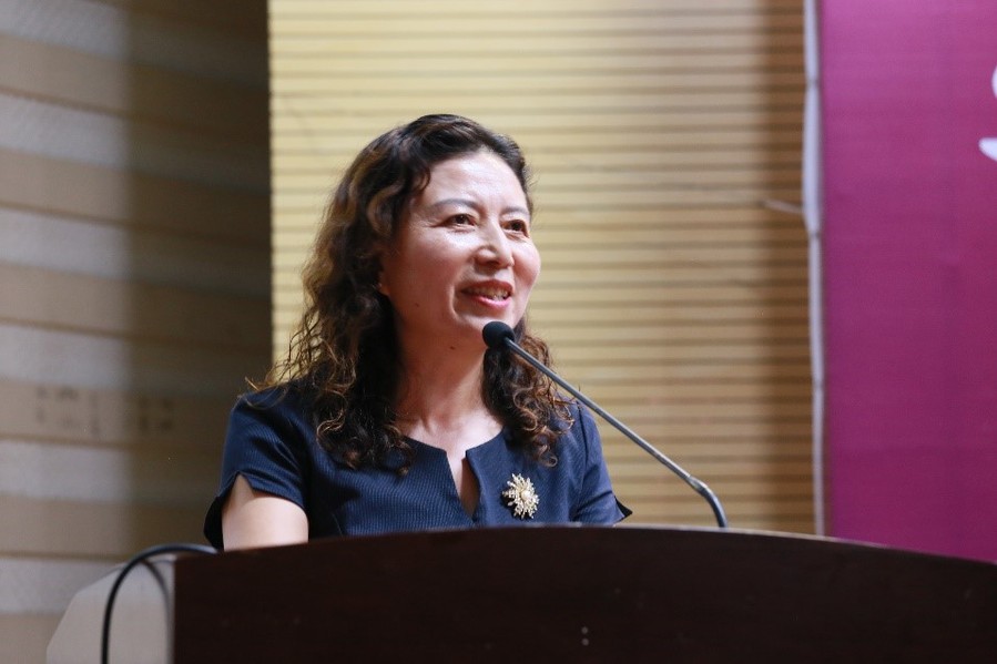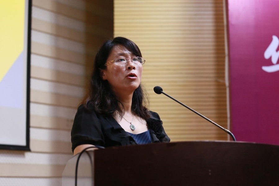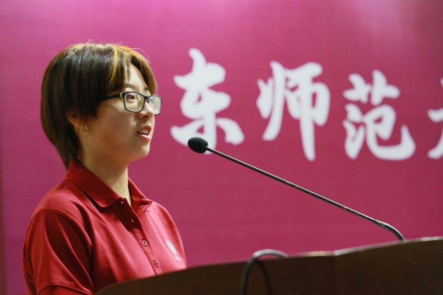 电磁场与微波技术专业2019级硕士研究生曹珂静代表研究生新生发言,她表示研究生的学习更需要自主性和创新性,特别是要主动去学、带着想法去学。她用“目标要明确,态度要端正”与研究生新生共勉,并期待在师大成长为有理想、有抱负、有追求、有担当“四有青年”,开出幸福之花。
