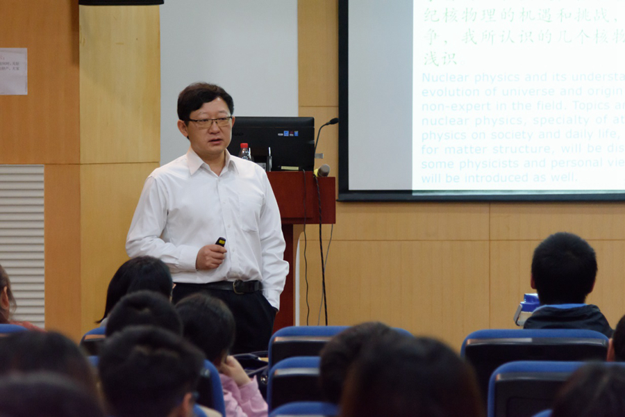 在讲座一开始,孟杰教授从自己年轻时即成为北京大学的一位教授开始,用诙谐的语气,讲到“不要在年轻时当教授”,成功调动起了全场的气氛。随后,孟教授从一张“以发现国家国旗为填充”的特殊的元素周期表入手,详细讲了新元素的发现制造所需的种种条件与重大意义,也点出了亚洲国家对于新元素发现贡献甚微的现象,并做了原因分析,鼓励我们后辈加紧努力。然后,孟教授从小尺度转到大尺度,讲到原子核物理在宇宙尺度的重要意义,并把人体本身与原子核物理相联系,进而谈到了原子核物理在现实生活中的重要作用。在整个讲座的过程中,孟教授将严密的学术公式和幽默的故事相结合,与会人员的情绪均被很好的调动,会场气氛非常活跃。除此之外,孟教授也没有回避核物理研究对于经济环境和设备条件的需求,并提出了“穷困的物理学家能做什么”的问题。