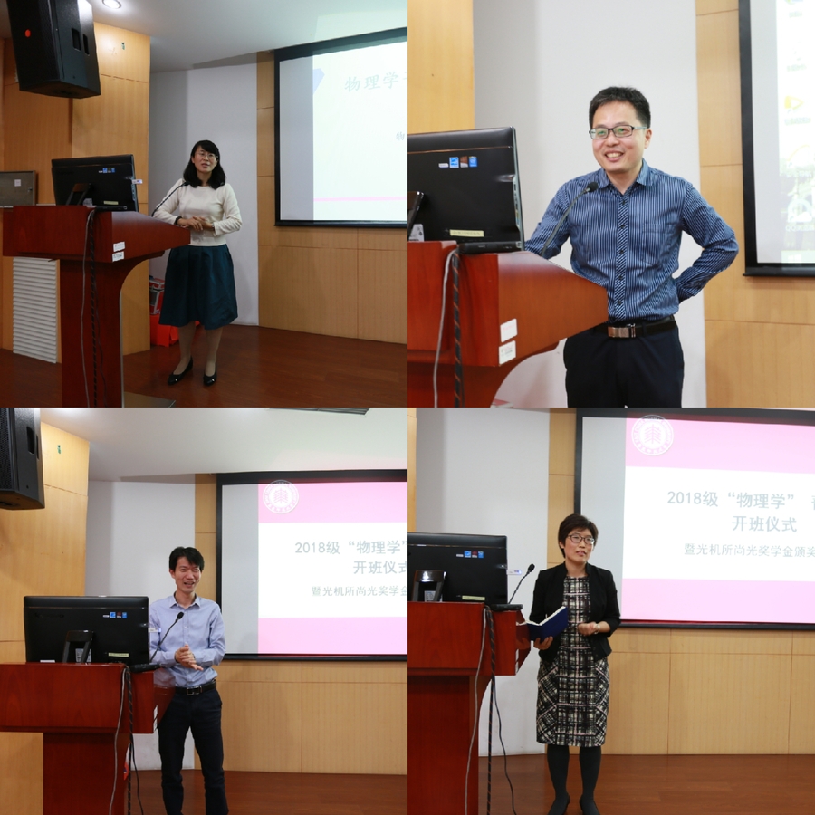 周先荣副院长着重介绍了物理学菁英班的情况,强调从科研配备、硬件保障、导师配备等全方位对菁英班同学进行培育,努力提升学生的国际化视野,尽可能提供优质平台帮助同学们实现“物理梦”。光机所副主任刘鹏介绍了光机所的园区、人才队伍及十三五规划布局等内容。精密光谱与国家重点实验室主任吴健希望同学们珍惜好的学习环境,高标准严要求自己,勇于面对学习生活中的各种困难。校教务处副处长谭红岩在讲话中指出,师大“育人、文明、发展”的三大使命相关的政策正在逐步落实,感谢光机所设立“尚光奖学金”对学生进激励。期待同学们不忘初心,珍惜时光;立长志立大志,不畏艰难险阻;把个人发展与社会发展相结合,从而实现个人的长足发展。