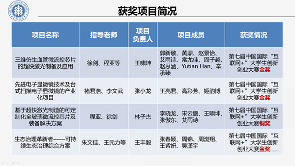 由褚君浩院士、李文武教授指导,电子系校友张小龙负责的“先进电子显微镜技术及台式扫描电子显微镜的产业化” 项目在高教主赛道师生共创组斩获金奖;由徐剑副研究员、程亚教授等指导,2018级物理专业菁英班王啸坤负责的“三维仿生血管微流控芯片的超快激光制备与应用”项目在高教主赛道本科生创意组斩获金奖;由程亚教授、徐剑副研究员指导,精密光谱科学与技术国家重点实验室2017级光学专业博士研究生林子杰负责的“基于超快激光制造的可定制化全玻璃微流控芯片及装备解决方案”项目荣获铜奖。此外,由我院2019级电子信息科学与技术专业本科生周渤翔参与的“生态治理革新者——可持续生态治理综合方案”项目荣获青年红色筑梦之旅赛道金奖。
