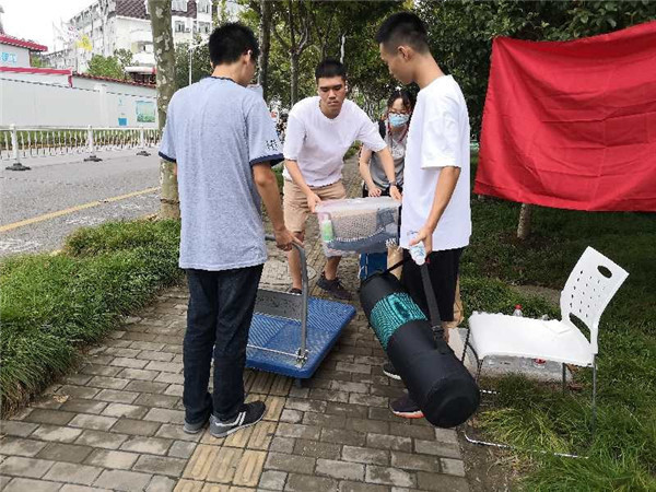 同时,师生党员佩戴党员徽章、亮明身份,积极参与迎新,发挥模范表率作用,研究生党员志愿者在剑川路公寓坚守岗位两天,帮助新生搬运行李,并为新生线上答疑,回答新生的各类问题和疑惑。