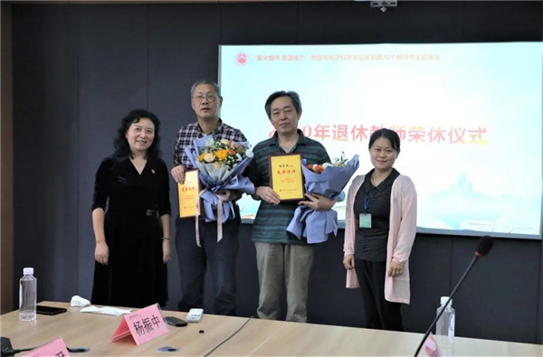 为进一步弘扬尊崇师道的文化理念,学院探索建立教师荣誉制度建设,主题座谈会上同时举办了退休教师荣休仪式。学院党委书记李恺、学院工会副主席王向晖向两位荣休教师赠送纪念铭牌,并感谢两位老师用认真严谨的态度、无私奉献的精神、德才兼备的品质数十载如一日为学校、学院的事业发展所作的贡献。