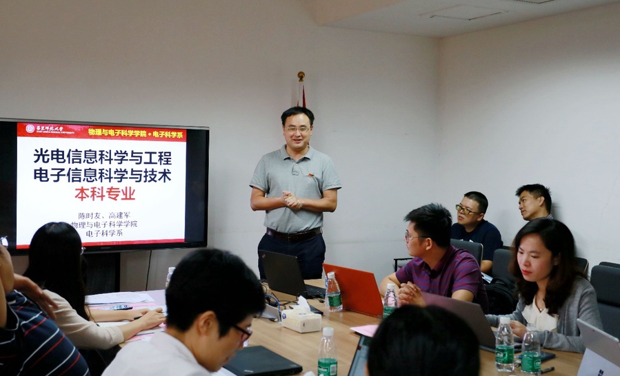 物理学系副系主任柴志方、袁春华,材料科学系副系主任欧阳威,电子科学系系主任陈时友,分别结合各系特色,围绕一流专业建设背景下的专业建设规划、平台课程及通识课程建设、实验室和实验教学建设、师范认证等工作进行汇报。