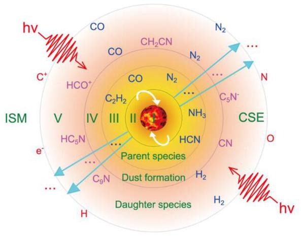 Illustration of molecular distribution in the circumstellar envelope of IRC+10216