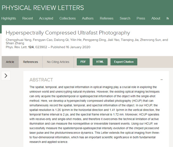 It has long been a dream, as well as a goal, for researchers to capture transient scenes at ultra-high speed. To do so, researchers can discover new natural phenomena, explore new physical processes, and drive new technologies. A team of ECNU researchers, headed by Zhang Shi'an and Sun Zhenrong in the State Key Lab of Precision Spectroscopy, have made a series of important advances in the field of compressed ultrafast photography (CUP).