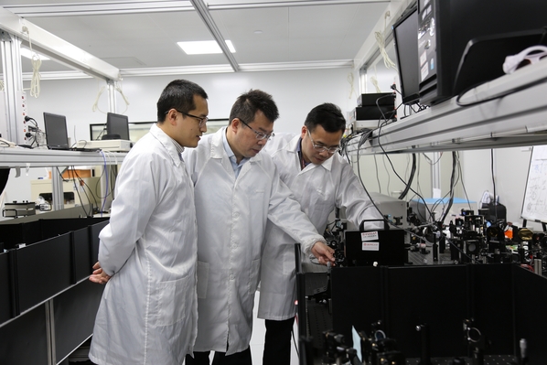 Qi Dalong (left), Sun Zhenrong (center) and Zhang Shi'an (right) work in the laboratory.